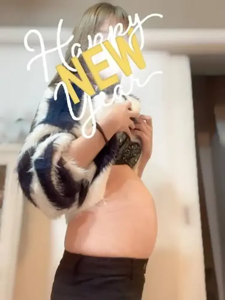 Under a loose dress, a slightly rounded belly.